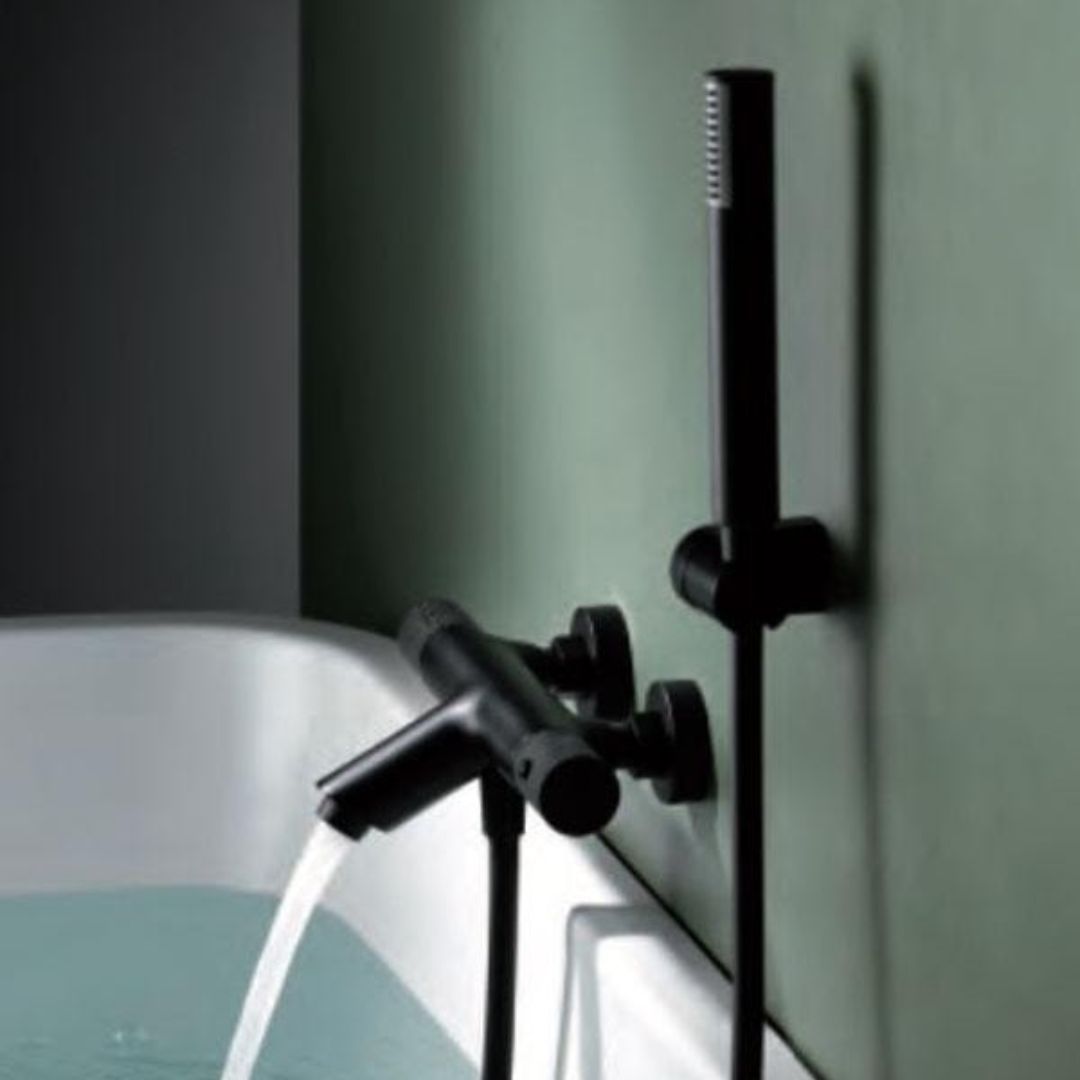 • THERMOSTATIC BATH-SHOWER MIXER IN MATT GRAY / CHAMPAGNE BRASS WITH BUILT-IN DISTRIBUTOR.